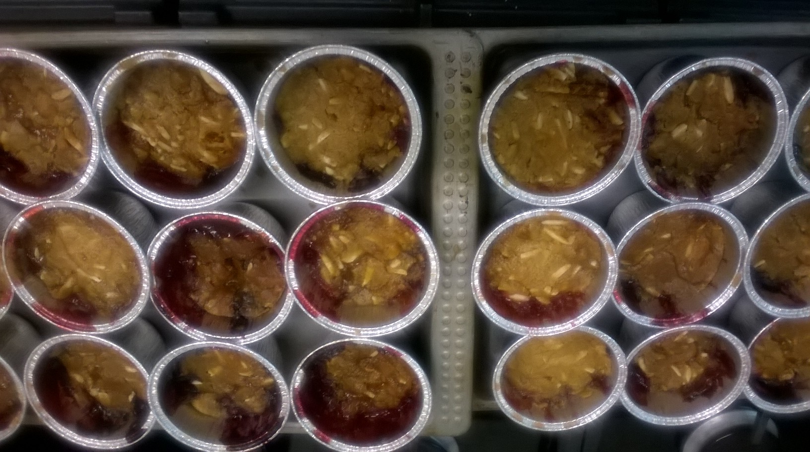 - In another bowl, blend flour, nuts, spices, and muscovado sugar, then rub in butter/margarine to make a crumbly dough.