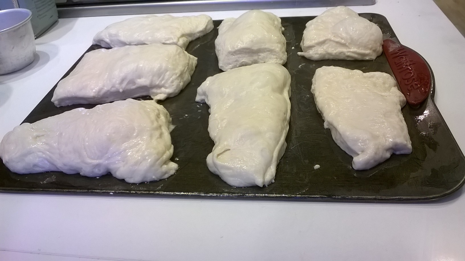 The Ciabbata dough was what we started with as this was the dough that needed most attention and proving time. The dough is a much sticker dough as it has a higher hydration count (more water). I am a bit old school and therefore like to make everything by hand. When we were told that we were going to make this dough in the Kenwood, I was horrified. However I very quickly realised there was a reason behind it, the dough would be too sticky to handle by hand and there would be a massive temptation to add more flour which would dry the dough out, which defeats the purpose of this type of bread. Lesson 1 was learnt, make sticky dough in a machine!