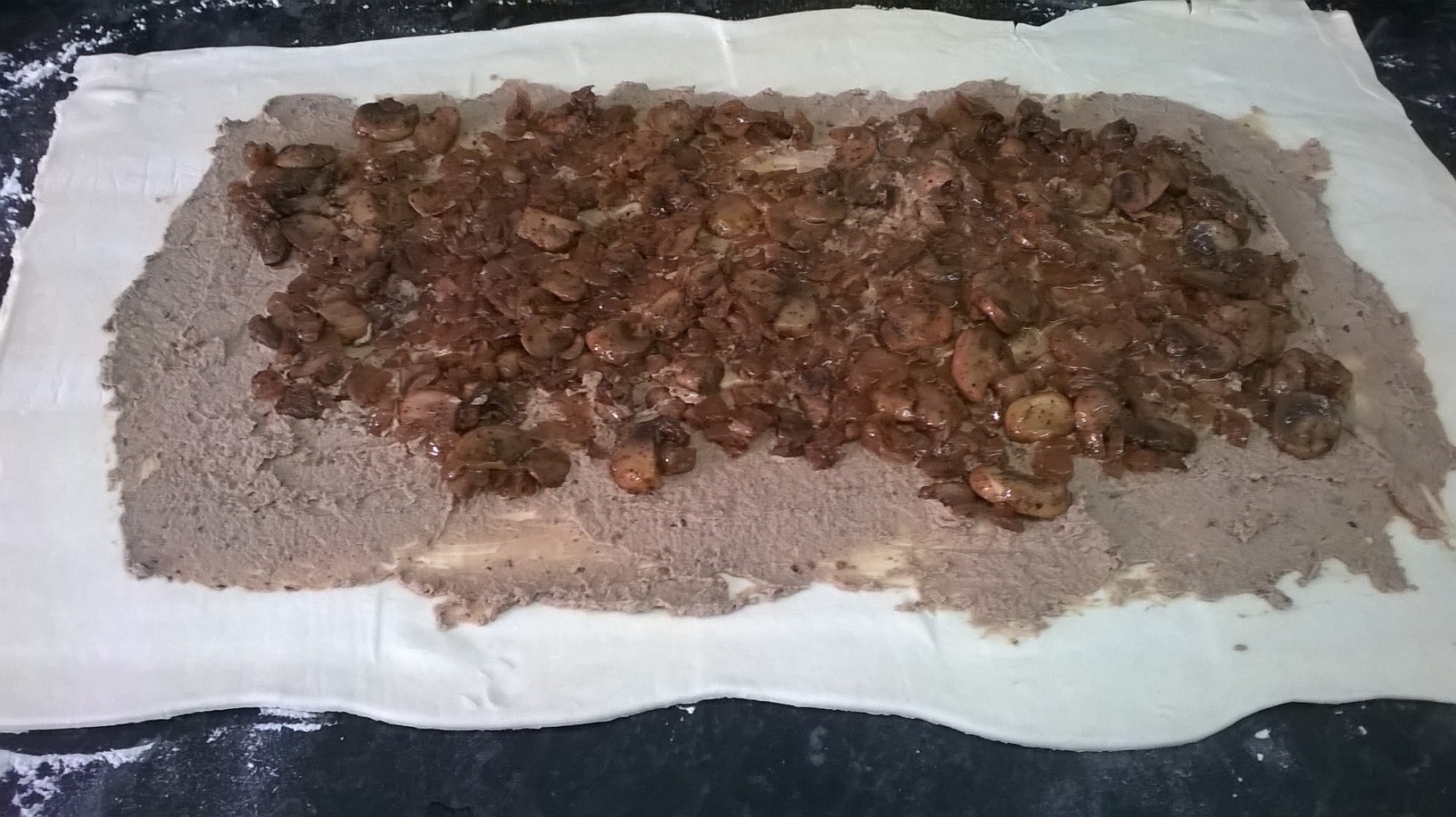 - Spread chopped liver thinly on pastry and spread onions and mushrooms on top.